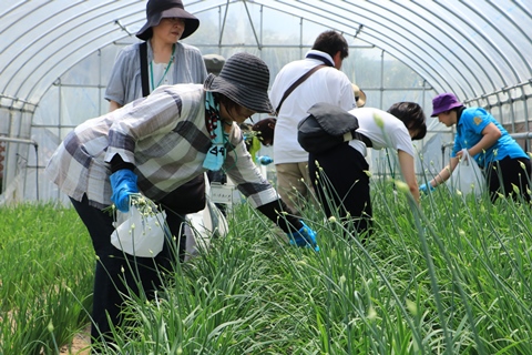お楽しみの「花にら」の収穫体験。 ハウスのあちこちに出ている旬の「花にら」を 一つ一つ丁寧に収穫していきました。 |