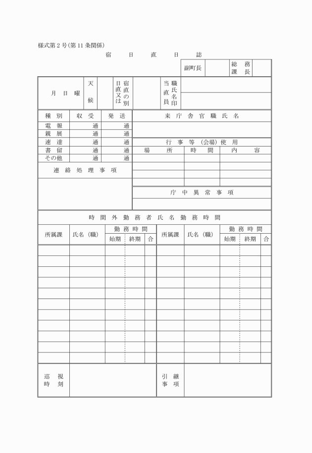 第11条 宿日直に必要な簿冊等は、次のとおりとする。